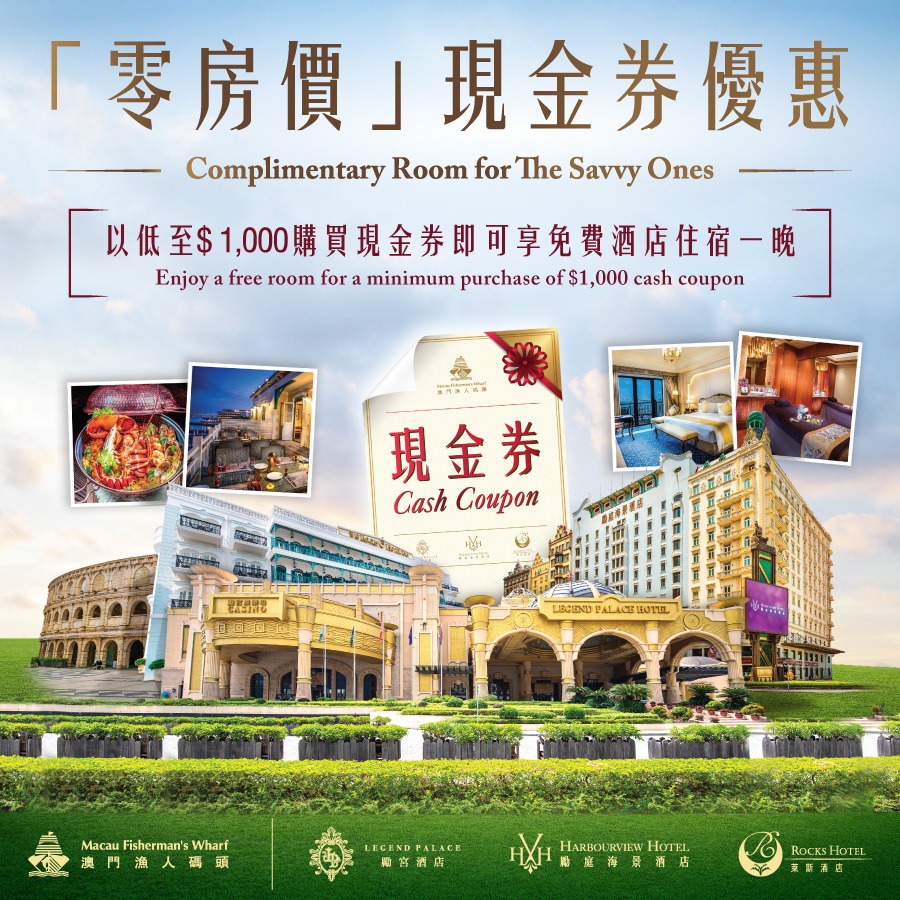 快把握機會,為自己及家人好友叉叉電!現只需購買澳門幣1,000或1,500的現金券,即送勵宮酒店、勵庭海景酒店或萊斯酒店極具歐陸風情的舒適住宿體驗一晚,現金券更可用於漁人碼頭多間餐廳、SPA及酒店訂房。一個價格,換來多倍精彩,精明享樂盡在澳門漁人碼頭!
