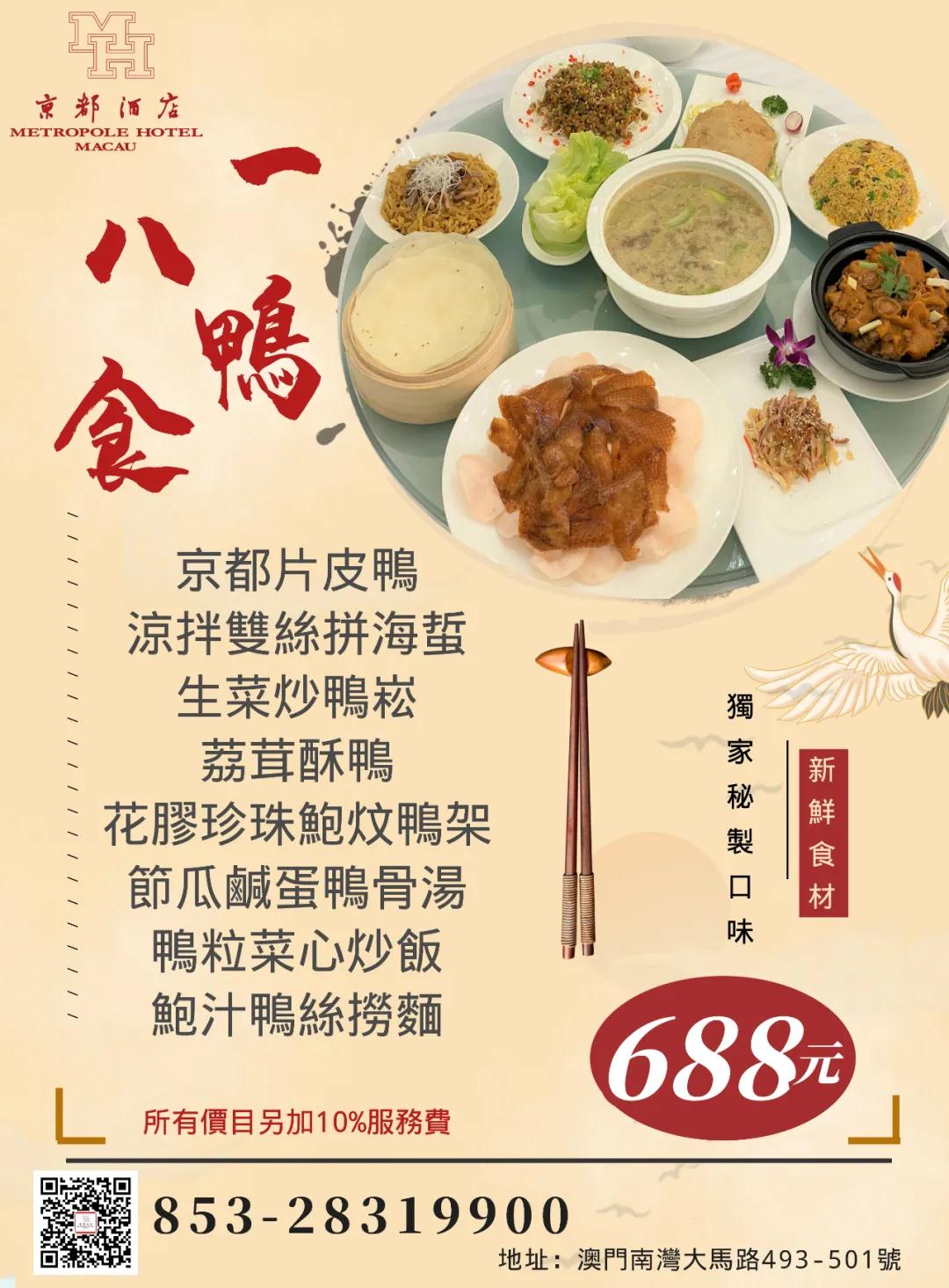 今日,為了回饋廣大顧客對京都酒店一直以來的支持,重新推出一鴨八食套餐,並在每日晚市供應。