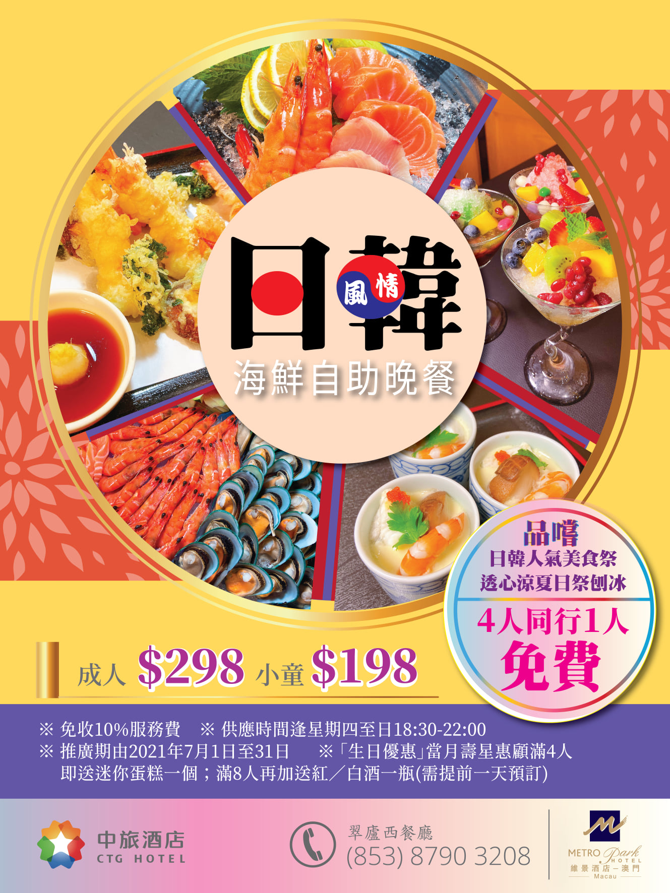 主打美食:日式魚生刺身、精選海鮮吧、天婦羅、關東煮、日韓風情冷熱盤美食、特色日韓小食區、日韓經典甜品、足料燉湯。