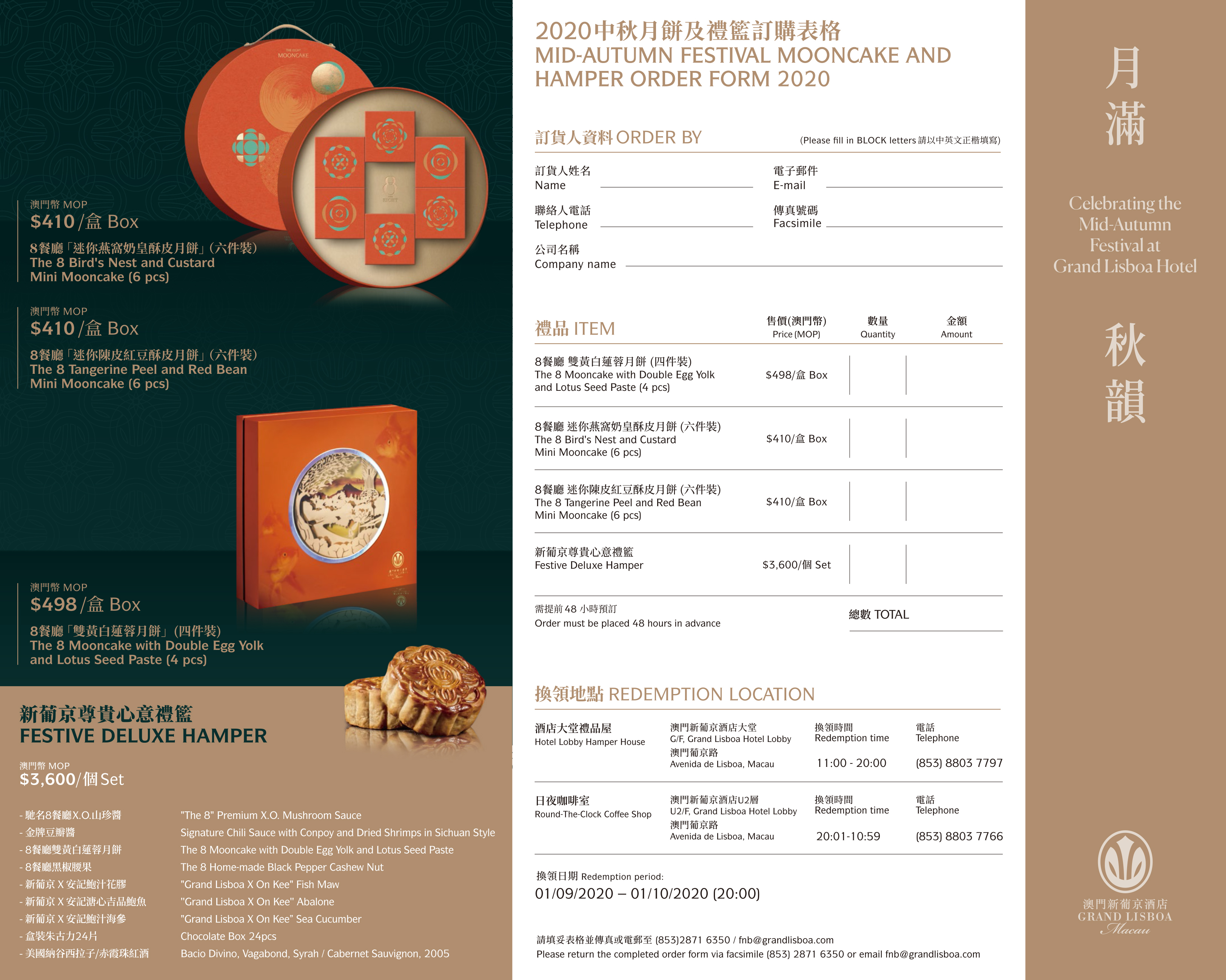 為慶祝中秋佳節,澳門新葡京酒店的米芝蓮三星高級粵菜食府「8餐廳」為賓客隆重呈現由點心主廚尤華輝師傅主理並精心設計的各式純正自家製月餅。為秉承傳統,尤華輝師傅及其團隊將再度以純人手打造真正的新葡京經典之作—「8餐廳雙黃白蓮蓉月餅」。8餐廳還首次推出兩款全新自家製迷你月餅:8餐廳迷你燕窩奶黃酥皮月餅以及8餐廳迷你陳皮紅豆酥皮月餅。備受歡迎的奶黃酥皮月餅融入了上等燕窩,而紅豆酥皮月餅則加入珍貴及健脾理氣的30年陳皮,無論是口感與味道都是奢華享受。8餐廳的每一款月餅都是由才華橫溢的點心師傅手工精心製作而成,讓所有賓客都可以在這個中秋佳節盡情享用。