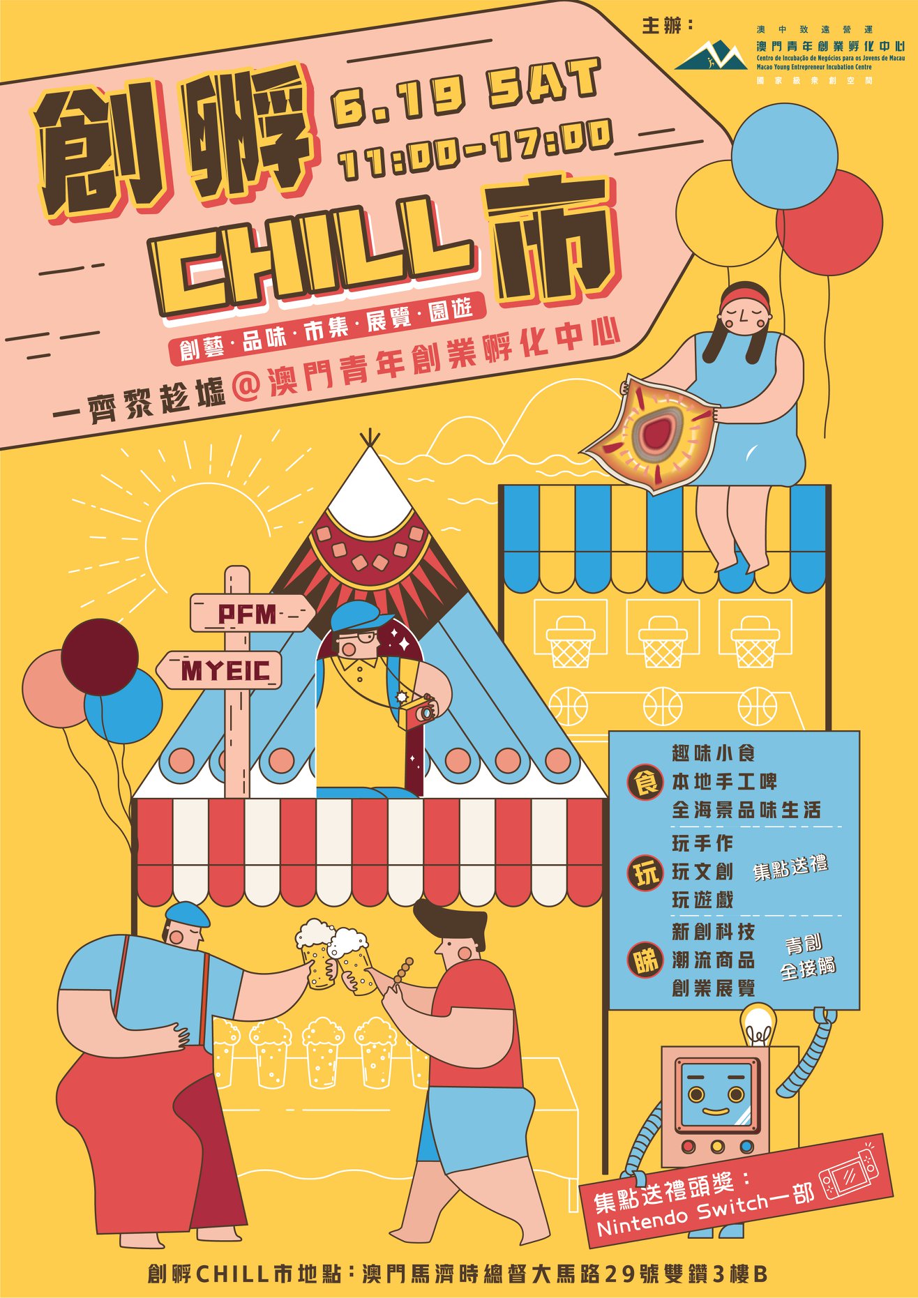 6月19日創孵中心開放日,現場將設有文創工作坊、小食攤位、有獎遊戲、創新產品展示,最最最重要喺,有無敵靚海景和野餐佈景區的影相打咭位,用至潮至Chill的方式帶你體驗澳門的創新魅力!活動適合一家大細和愛Chill的你來玩唷!