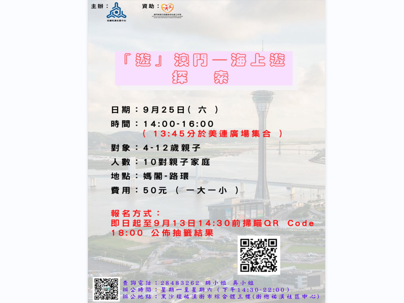 各位家長小朋友今次我地有一個海上遊的活動,沿途可欣賞到澳門的景色,歡迎各位家長同小朋友一起參加!
