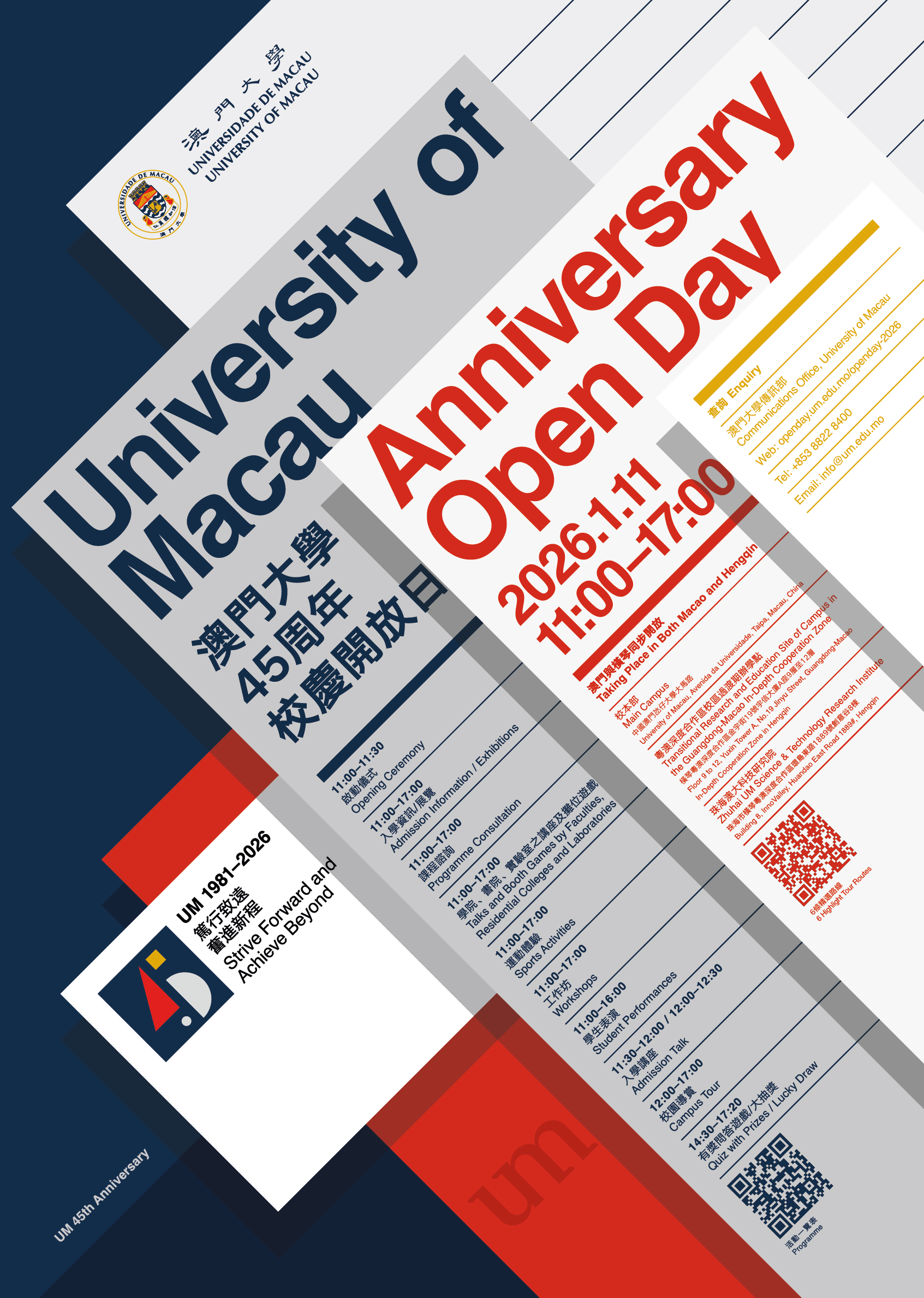 澳門大學是本澳歷史最悠久的高等教育機構,今年迎來45周年校慶。是次校慶開放日活動精彩不斷,包括入學講座、課程諮詢、科普講座、運動體驗、攤位遊戲、工作坊和大抽獎等,更設多條精選主題校園導賞路線,帶訪客深入校園,近距離體驗大學的學習與生活環境。